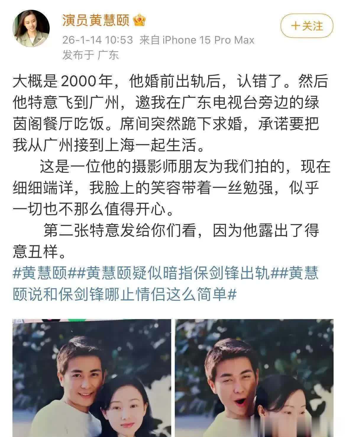 今日,黄慧颐在微博怒斥保剑锋,揭露其2000年婚前出轨的事实。更令人震惊的是,她称当时保剑锋向她认错,并承诺带她去上海生活。同时,两人昔日合照曝光,如一道闪电,拨开了这段往事的迷雾。