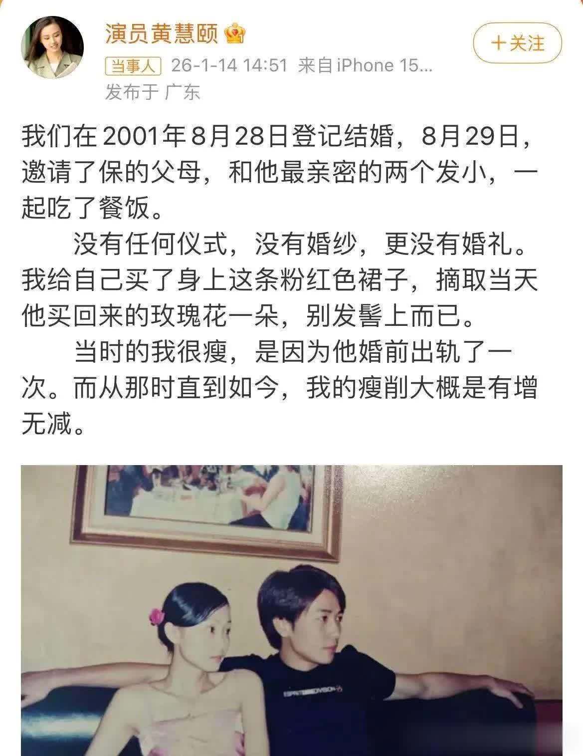 紧接着,黄慧颐曝出,2001年8月28日,她和保剑锋在无婚纱、无婚礼、无宴席的情况下匆忙领证结婚。彼时,婚礼的唯一见证人除保剑锋父母外,便是其最亲密发小,众人仅围坐用餐。这般看似平常的婚姻,背后竟藏着诸多难以言说的故事。